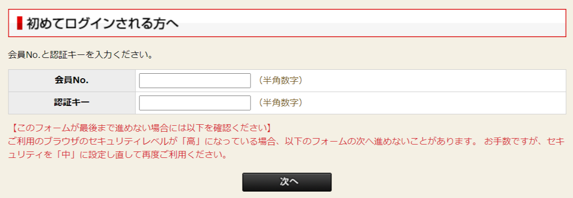 [ 会員No. ] と [ 認証キー ] を入力し [ 次へ ] ボタンを押してください。